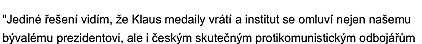 • Klaus jako Horáková. Dostal metál za boj proti komunismu. Napsaly jedovatě Lidovky.cz. Klaus převzal ve Washingtonu Trumanovu-Reaganovu medaili svobody, kterou každý rok uděluje nezisková organizace Victims of Communism Memorial Foundation. Medaili v minulosti získal například i bývalý polský prezident Lech Walesa, bývalý papež Jan Pavel II. či Milada Horáková. Organizace ocenění udílí osobnostem, které prokázaly celoživotní oddanost svobodě a demokracii a byli vždy odpůrci komunismu a jiných forem tyranie. Václav Klaus během svého projevu při přebírání ceny poděkoval za připomínání obětí komunismu. "Komunismus nesmí být zapomenut. Tragédie, které jsou s ním spojené, nesmějí být marginalizovány, nesmějí být politicky korektně dezinterpretovány, ne-li dokonce omlouvány, nesmějí být považovány za neopakovatelný výstřelek, ke kterému došlo více méně náhodou," uvedl Klaus. Bývalý český prezident ve své řeči zdůraznil, že se nyní "musíme utkávat s komunismem v jeho nových převlecích, v nových šatech, které jsou občas tak elegantní a barevné, že zakrývají jejich skutečný obsah". Následně mezi těmito novými formami vyjmenoval agresivní human-rightismus, který se podle něj přeměnil v mocný nástroj potlačování tradičných občanských práv, transnacionální progresivismus, jenž propaguje globální vládnutí, morální relativismus a moderní environmentalismus a jeho extrémní verze, kterou je doktrína globálního oteplování.Jiný přítel napsal: "Mne fascinuje, jak se všichni opupínkovávají, že Václav Klaus dostal antikomunistickou cenu v USA a všichni s vyrašenými pupínky jsou zcela klidní, že u nás doma bolšáni obsadili většinu ústavních institucí včetně úřadu, který zkoumá, kde udělali soudruzi (nejen z NDR) chybu. Bolšání v TV, bolšáni a StBáci se chystají do vlády, kupují si noviny a časopisy (TV až po volbách), ale většina opupínkovaných řeší Václava Klause."