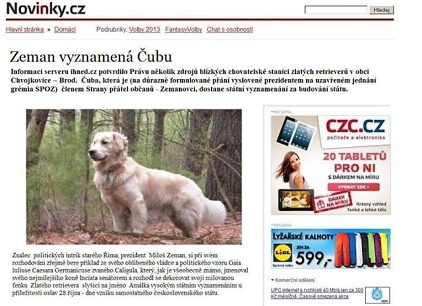 • A v Reflexu zaperlil mnou stále více oblíbený Jiří X. Doležal. Prý "Krysa pro ministra financí Fischera." Reflex předal ocenění Politická sviňárna roku panu ministrovi financí v demisi Janu Fischerovi. Věříme, že mu cena, kterou vyhrál, přinese mnoho radosti i poučení. V pondělí ministerstvo financí sdělilo, že bude podávat trestní oznámení na bývalého ministra financí Miroslava Kalouska. Že prej špatně hospodařil se státním majetkem při sporech kolem arbitráží. Na věci by nebylo nic zvláštního, kdyby Kalousek nekandidoval do voleb a ty volby nebyly v pátek. Zveřejnit podobnou informaci pět dní před volbama je neskutečně nechutná politická sviňárna. Věřím, že za to pan Fischer dostane od Zemana nějaký pěkný diplomatický post. A aby mu v cizině nebylo smutno a necítil se tak sám, koupili jsme mu adekvátní společnici.