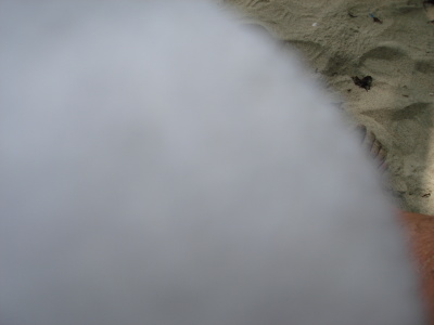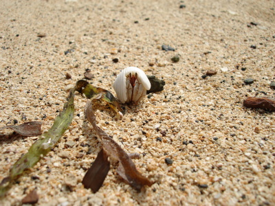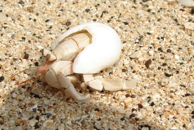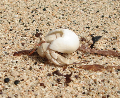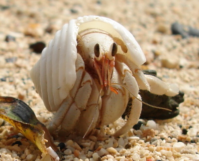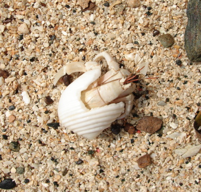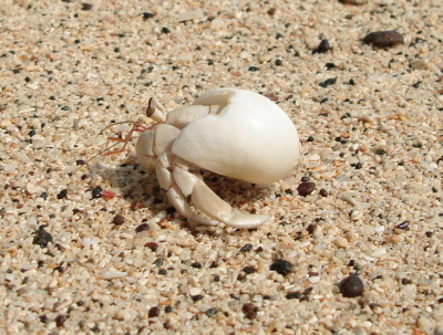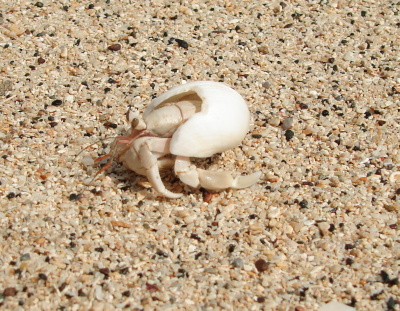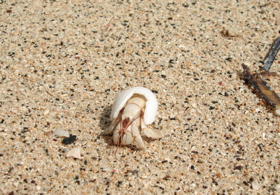 Já si našel na pláži neobvykle bílého (možná albínek) krabíka poustevníčka a rozhodl jsem se udělat pár makrofotografií t.j. úplně zblízka. Krabík ovšem byl plachý a jak zblikl pohyb, zalezl. Tak jsme  asi půl hodiny na sebe číhali. Protože mně bolely ruce, rozhodl jsem se ho přelstít. Foťák jsem položil na trepku, sedl si se široce rozkročenýma nohama a k foťáku natáhl  zpovzdálí jenom ruku. Poustevníčka jsem přelstil a pár fotek udělal. Když už jsem chtěl končit, moře, které do té doby tiše šplouchalo nějakých 5 metrů daleko si žbluňklo, poustevníčka spláchlo, a mého Sonyho zalilo tak že výsuvný objektiv jen hekl a už se nezasunul. Přesně v okamžiku, kdy jsem mačkal spoušť. Šplouchnuvší vlnu jsem tak také zachytil. Jaké bylo mé překvapení, když po chvíli trucování SONY opět začal fungovat. Jak skončil poustevníček se už nedozvíme. Poučení z toho plyne takové, že na pláži máte mít foťák v kejsu tak jako 30 m pod vodou.