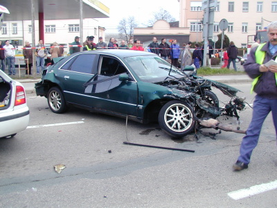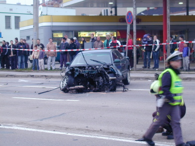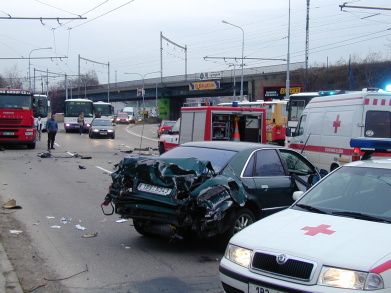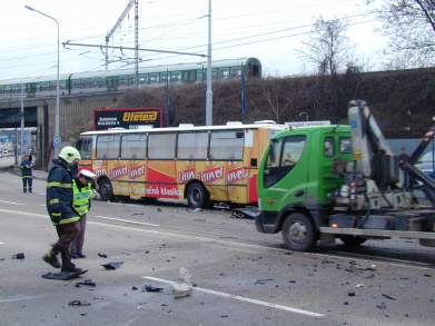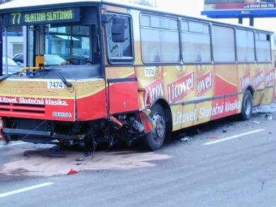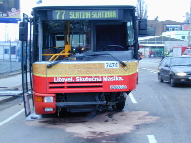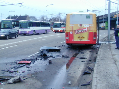 Předevčírem na Olomoucké  havaroval poblíž benzínové pumpy Agip autobus městské hromadné dopravy s osobním autem. Tři lidé v autobusu a řidič auta byli zraněni. Podívejte se na ten masakr. Některým šoférům bych nesebral jen body.