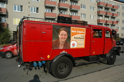Před školou nám konkurovala namalovaná Kačírková zase na hasičáku. Asi potřebuje hasit ty průšvihy co po sobě zanechá